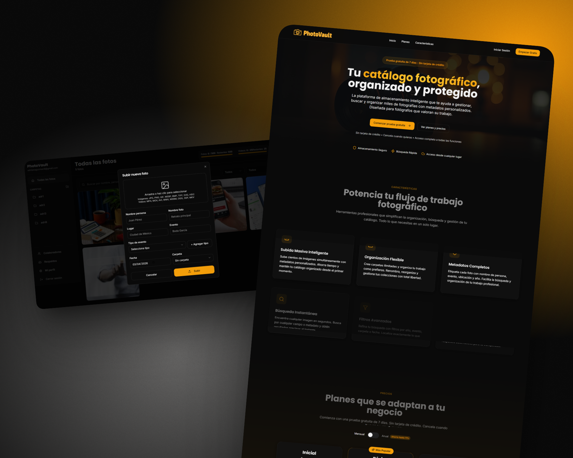 Photovault es una plataforma de almacenamiento inteligente diseñada para fotógrafos que necesitan gestionar grandes volúmenes de imágenes de forma organizada, rápida y segura. Permite almacenar, clasificar y encontrar fotografías en segundos mediante el uso de metadatos personalizados, optimizando completamente el flujo de trabajo profesional.